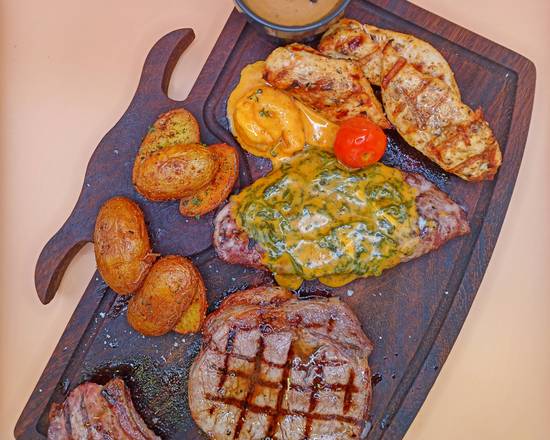 Striploin, lamb chop, grilled chicken breast, rokka meatball and king prawns. Served with garlic potatoes.